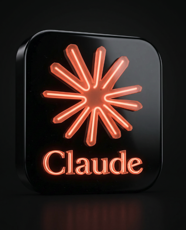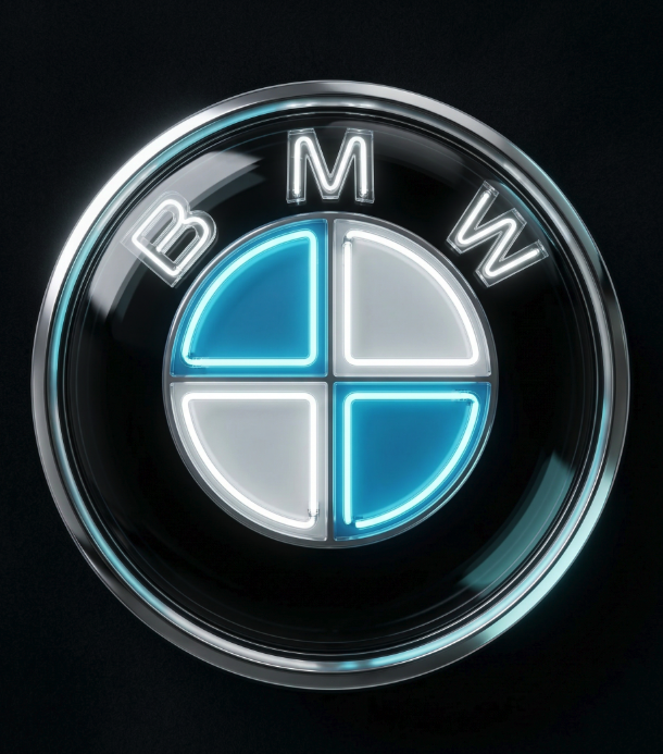 A 3D rendering showcases the logo within an elegant, rounded emblem with a glossy finish and black background. Each light on the polished surface adds depth to the clean, modern shapes, which appear to be made of translucent acrylic with internal neon lighting, creating a stylish aesthetic.