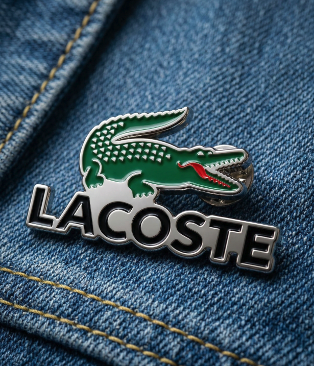 Create a hyperrealistic 3D render of [LOGO], transformed into a high-quality enamel pin. The pin should feature sleek, shiny metallic edges with solid, vibrant enamel colors. The design should be detailed with a glossy finish and placed against a close-up denim background, highlighting the texture and stitching of the fabric. The lighting should create soft reflections on the metal edges and enhance the enamel's depth, making the pin look lifelike and tangible."