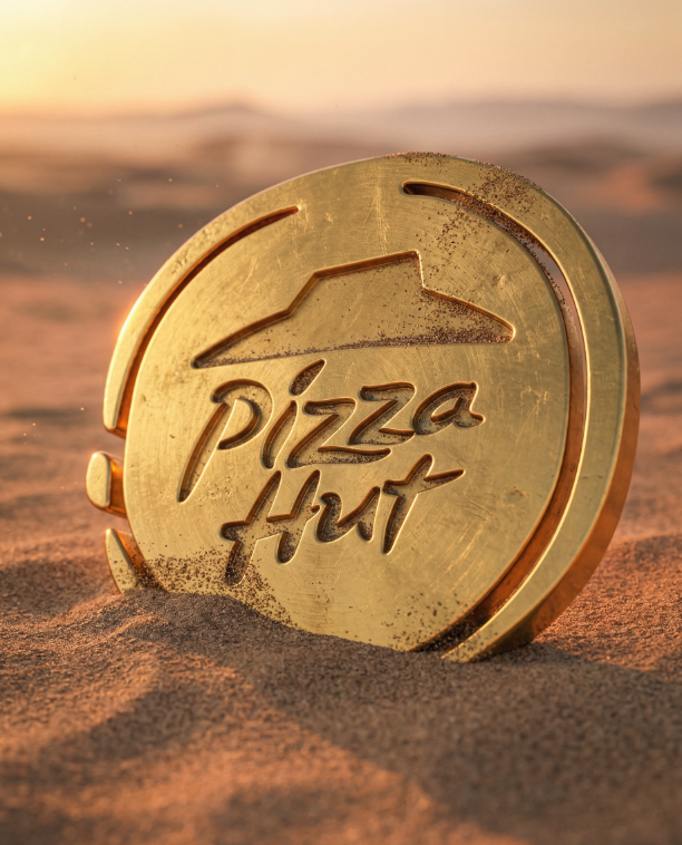Ultra-realistic cinematic composition of a golden logo emblem emerging from fine desert sand at sunrise. The logo should appear partially buried, with grains of warm sand resting on its edges and engraved surfaces. Render the logo in brushed 24-karat gold with subtle imperfections, micro-scratches, and realistic reflections.