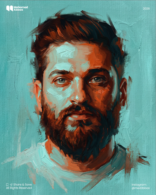 “A vibrant, expressive oil portrait of a (100% original from the attached photo). The painting features thick impasto brushstrokes, a rough texture, and visible canvas grain. The style is abstract realism with an unfinished quality at the edges. The color palette is a dramatic contrast between the soft turquoise background and shadows with burnt orange and rust highlights on the face. The side lighting is soft, melancholy, dramatic, the painting style, the brushstrokes are broad and visible.”